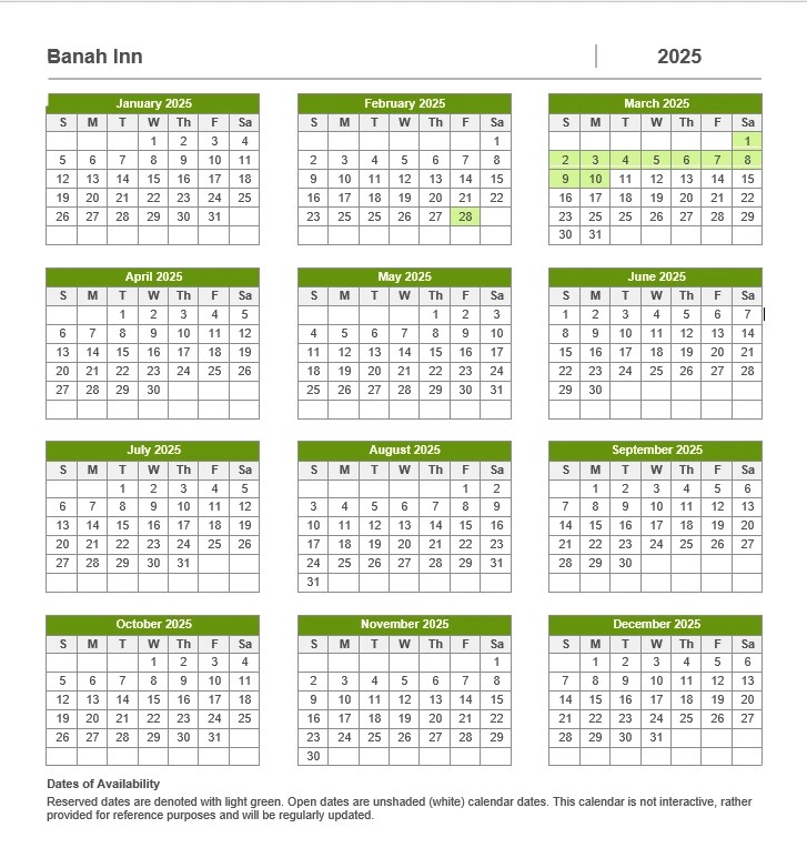 Reservations calendar 2025 Dates of AvailabilityReserved dates are denoted with light green. Open dates are unshaded (white) calendar dates. This calendar is not interactive, rather, provided for reference purposes and will be regularly updated. Share this: Click to share on Facebook (Opens in new window) Facebook